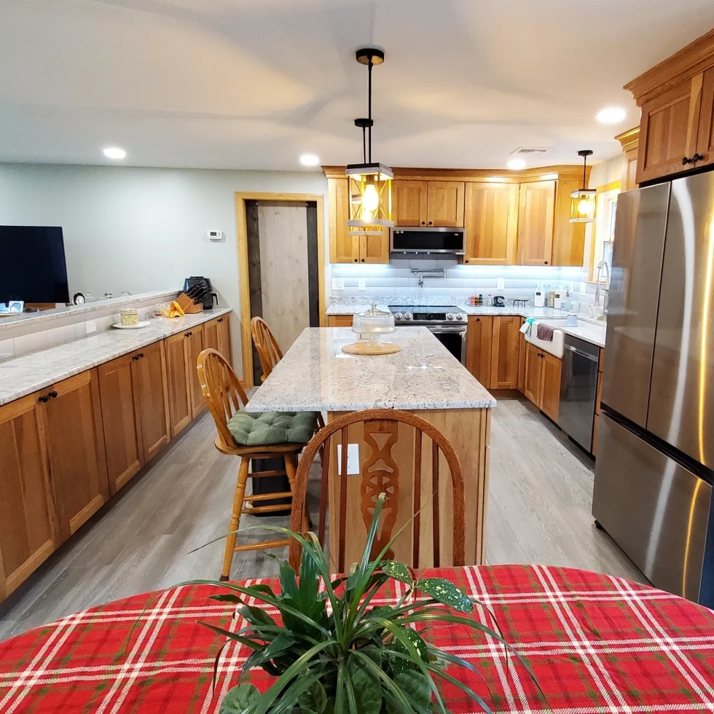 Open concept kitchen and dining room remodel with all new kitchen, flooring and fixtures