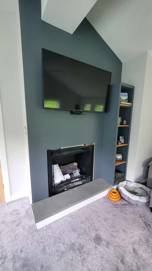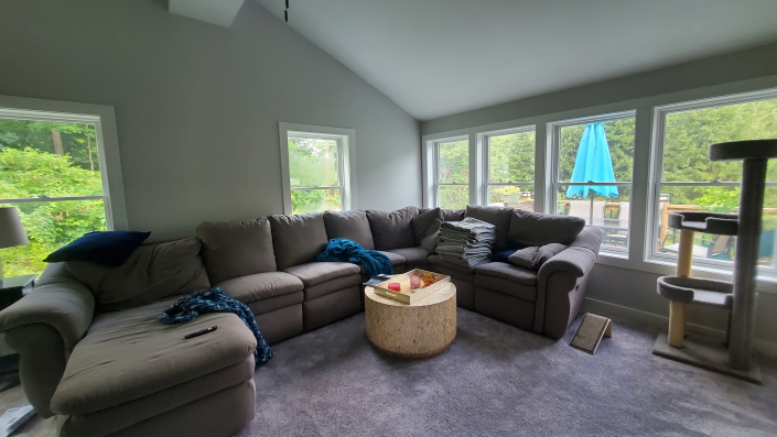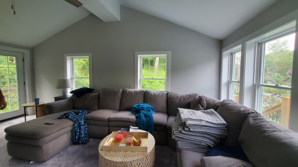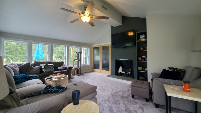 We remodeled this existing addition with a new layout featuring all new windows and new partitions that house a custom bookcase and fireplace. Reframed doorway to the existing home to fit new French-style doors.