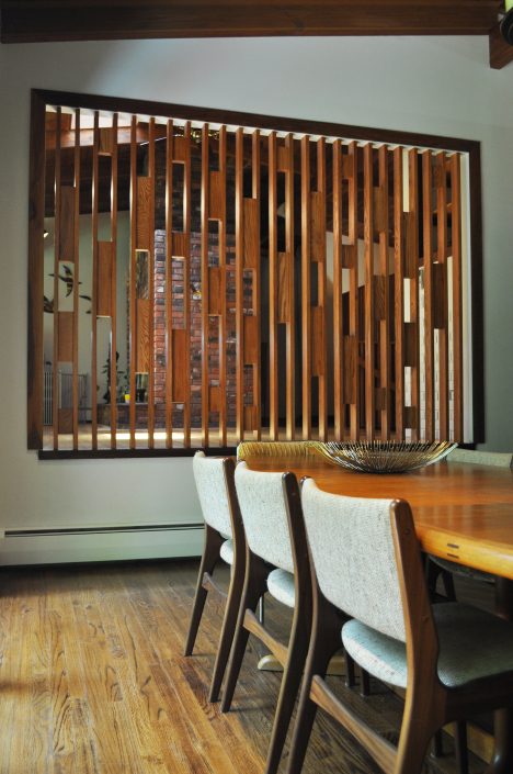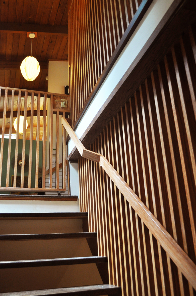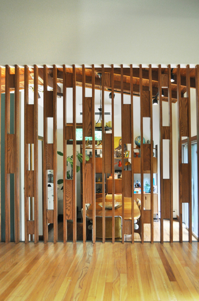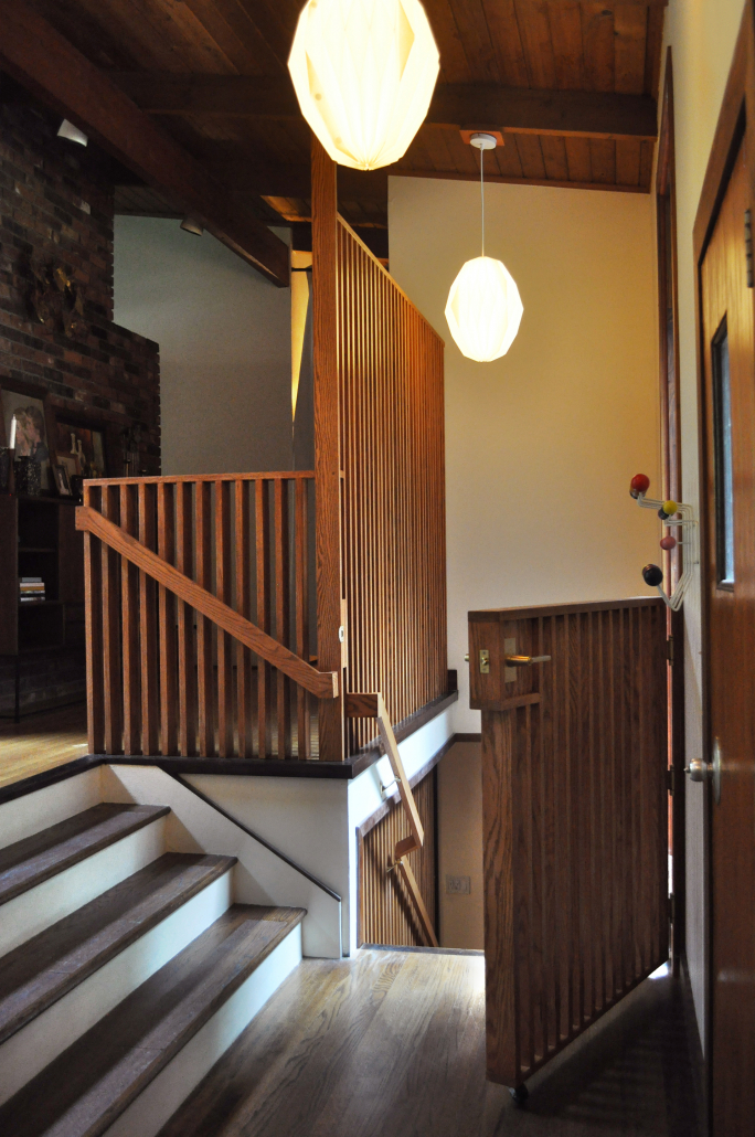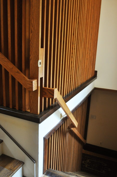 Custom built oak slat style partition and railing, accompanied by a matching gate and room divider with random block pattern.